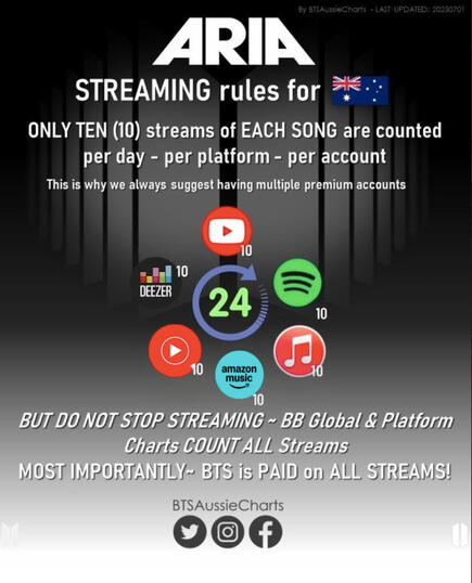 ARIA only counts TEN streams of a song per day, per account, per platform.This is why we strongly encourage Aussie ARMY to diversify their streaming platforms. This allows you to 'rest' one platform and use another to get more streams in.BUT we DO NOT stop streaming after 10 reps of a song.Because: